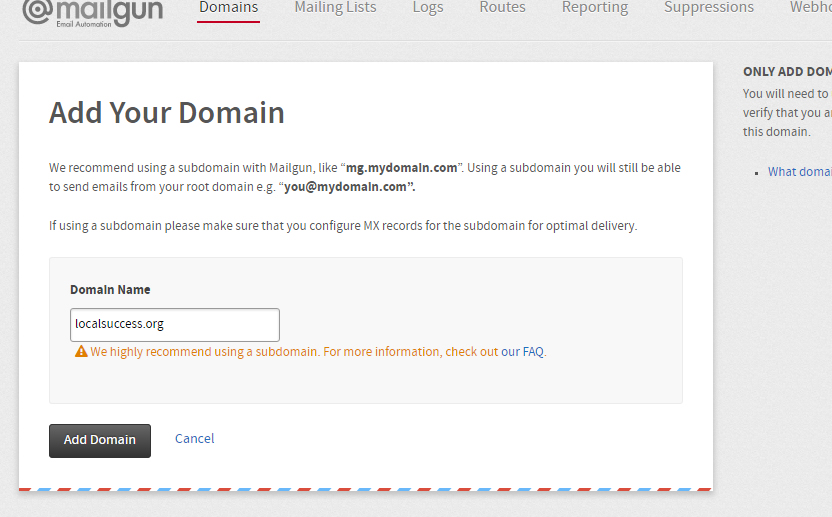 Mailgun advises using a subdomain to avoid messing up your root domain’s MX records. But if you are on Cloudways/ServerPilot or on your own at DO/Vultr/Linode, you probably don’t have an email server to point those MX records to anyway. Plus, using a subdomain here will potentially create more problems for you in the future hence go ahead and put your root domain in the box.